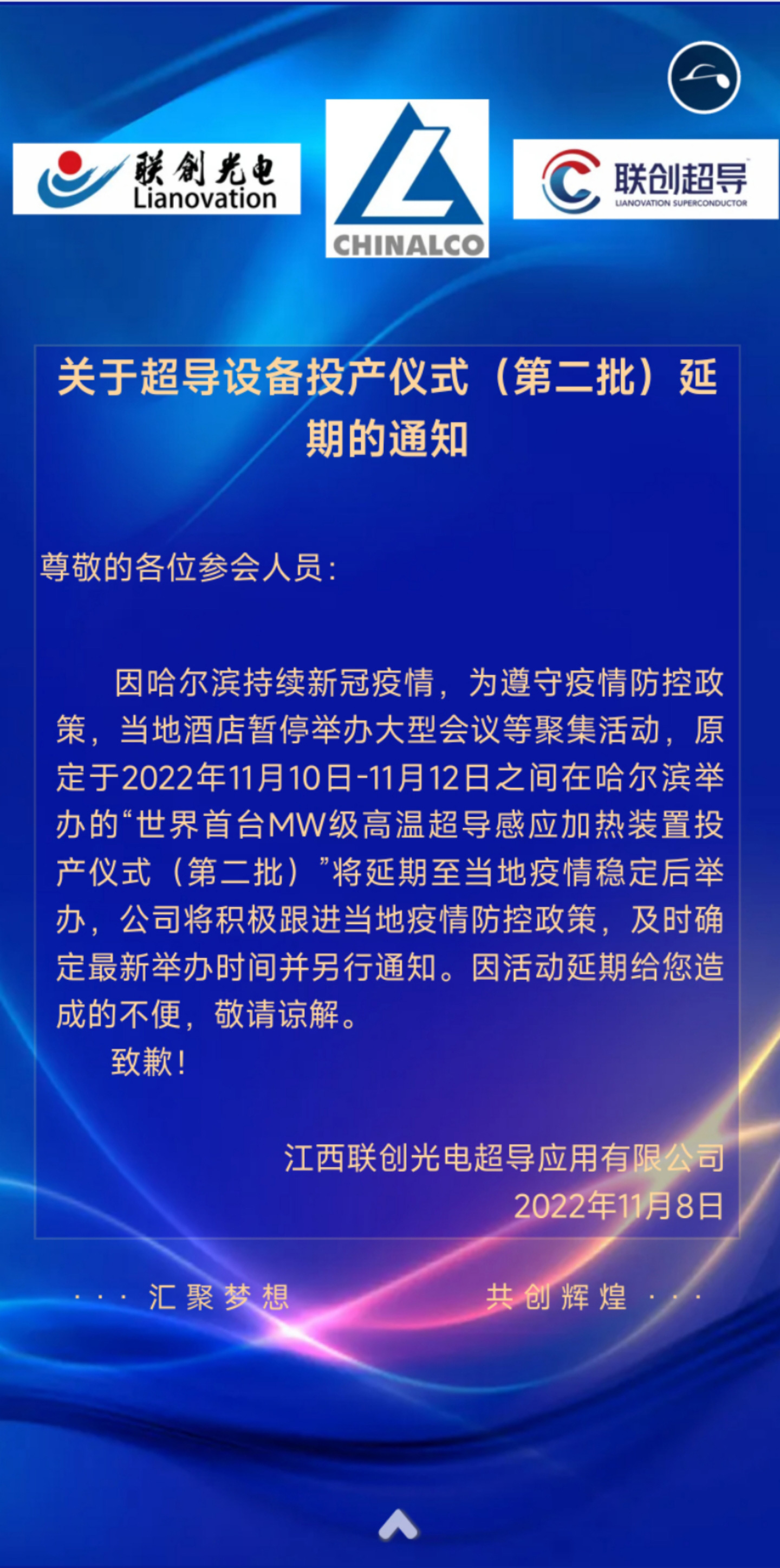 關(guān)于超導(dǎo)設(shè)備投產(chǎn)儀式(第二批)延 期的通知