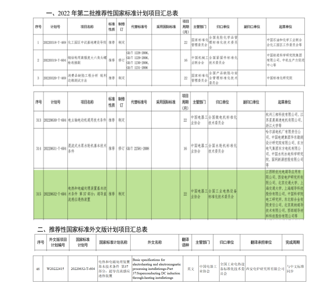 近日,國(guó)家標(biāo)準(zhǔn)化管理委員會(huì)(以下簡(jiǎn)稱“國(guó)標(biāo)委”)發(fā)文下達(dá)2022年第二批推薦性國(guó)家標(biāo)準(zhǔn)計(jì)劃及相關(guān)標(biāo)準(zhǔn)外文版計(jì)劃,我集團(tuán)旗下子公司-江西聯(lián)創(chuàng)光電超導(dǎo)應(yīng)用有限公司(以下簡(jiǎn)稱“聯(lián)創(chuàng)超導(dǎo)”)作為目前全球首家兆瓦級(jí)超導(dǎo)感應(yīng)加熱裝置的生產(chǎn)單位,牽頭申報(bào)的《超導(dǎo)直流感應(yīng)透熱裝置》推薦性國(guó)家技術(shù)標(biāo)準(zhǔn),獲批立項(xiàng),正式進(jìn)入標(biāo)準(zhǔn)草案起草階段,其作為全球領(lǐng)先的技術(shù),將同步翻譯英文版標(biāo)準(zhǔn)。