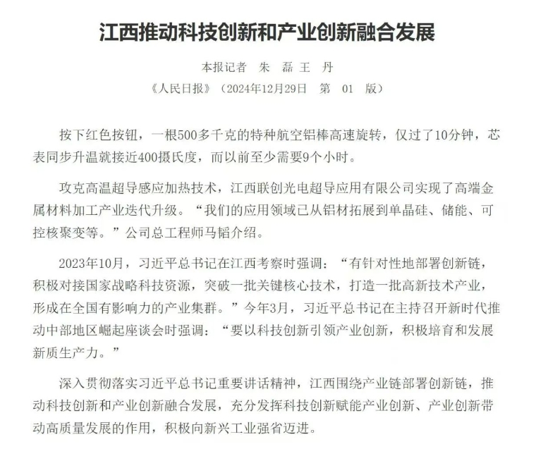 攻克高溫超導(dǎo)感應(yīng)加熱技術(shù),江西聯(lián)創(chuàng)光電超導(dǎo)應(yīng)用有限公司實(shí)現(xiàn)了高端金屬材料加工產(chǎn)業(yè)迭代升級?!拔覀兊膽?yīng)用領(lǐng)域已從鋁材拓展到單晶硅、儲能、可控核聚變等?!惫究偣こ處燅R韜介紹。